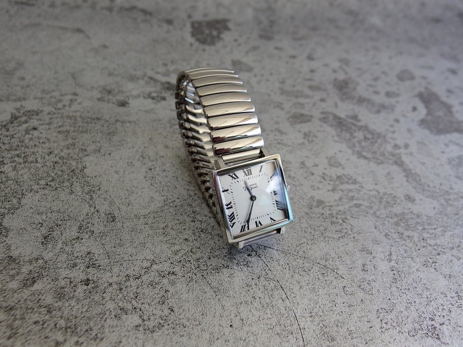 採用したエクステンションベルト(伸縮タイプ)は1950年代のミッドセンチュリー期にアメリカンウォッチなどで多く見られた当時と同じ構造で、コマの繋ぎ目がバネ式になっており工具を使わずにご自身でベルトの調整が出来る仕様となっております。