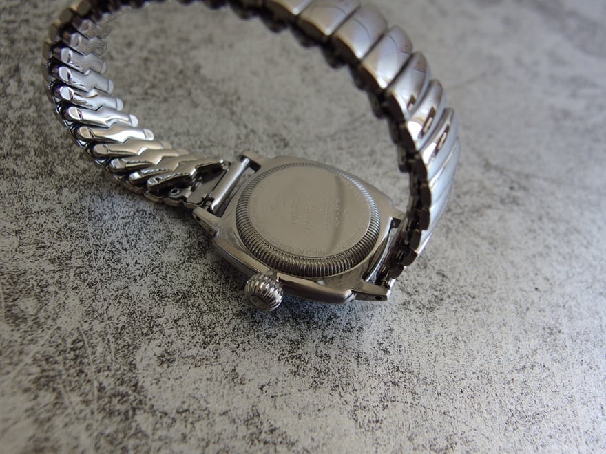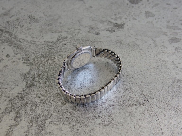 採用したエクステンションベルトは1950年代のミッドセンチュリー期にアメリカンウォッチなどで多く見られたコマの繋ぎ目がバネ式になっているベルトで工具を使わずにご自身でベルトの調整が出来る構造となっております。