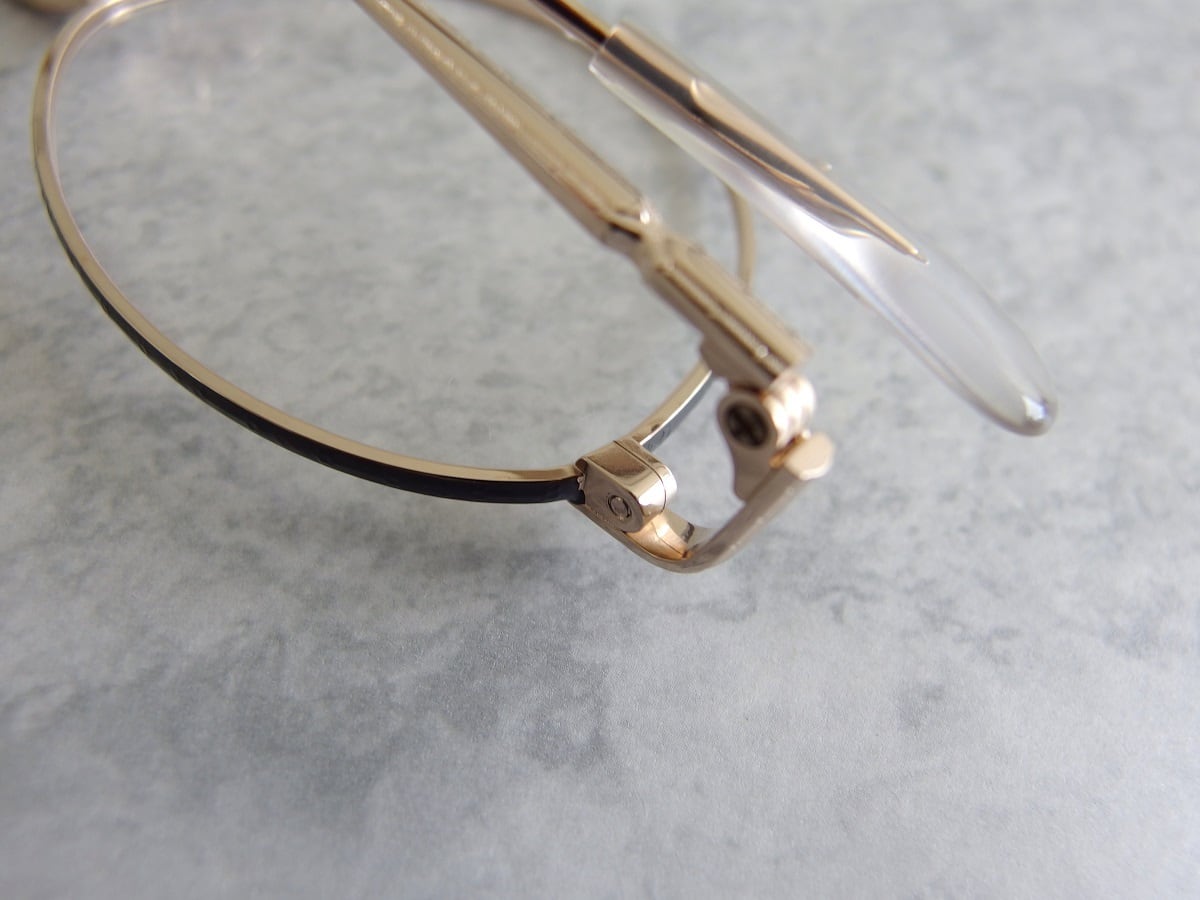 彫金を施し そのうえから七宝加工をしたリム(フロント)と、光沢感のゴールドテンプルの対比が非常に美しく仕上がっています。